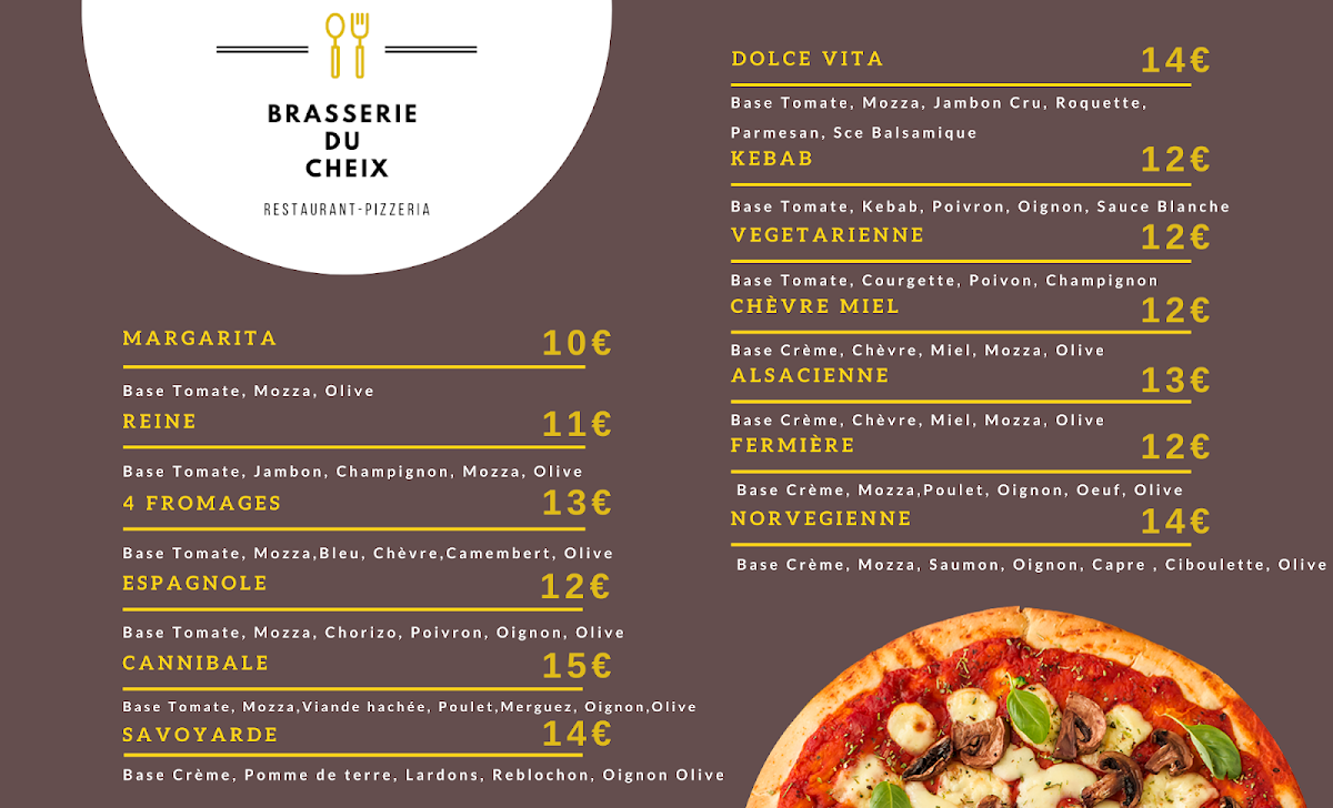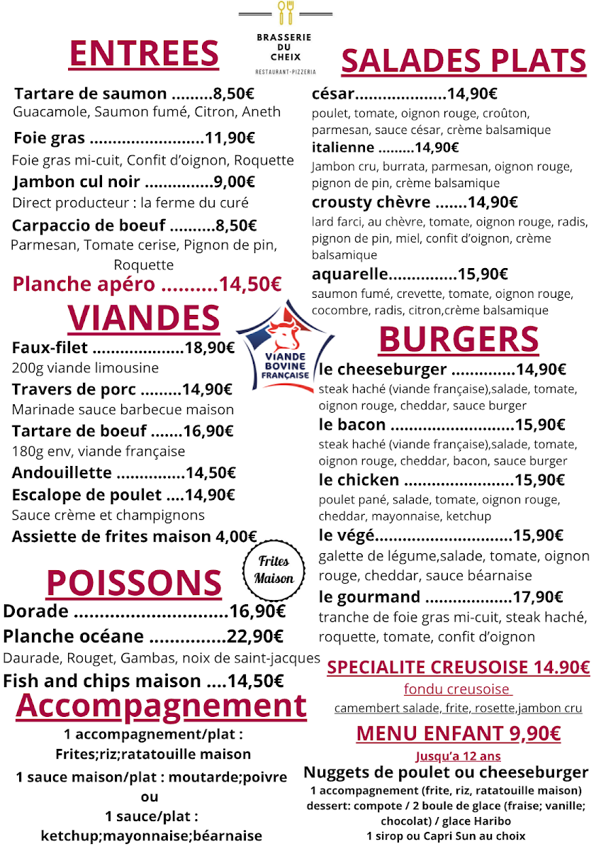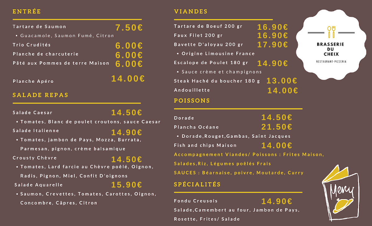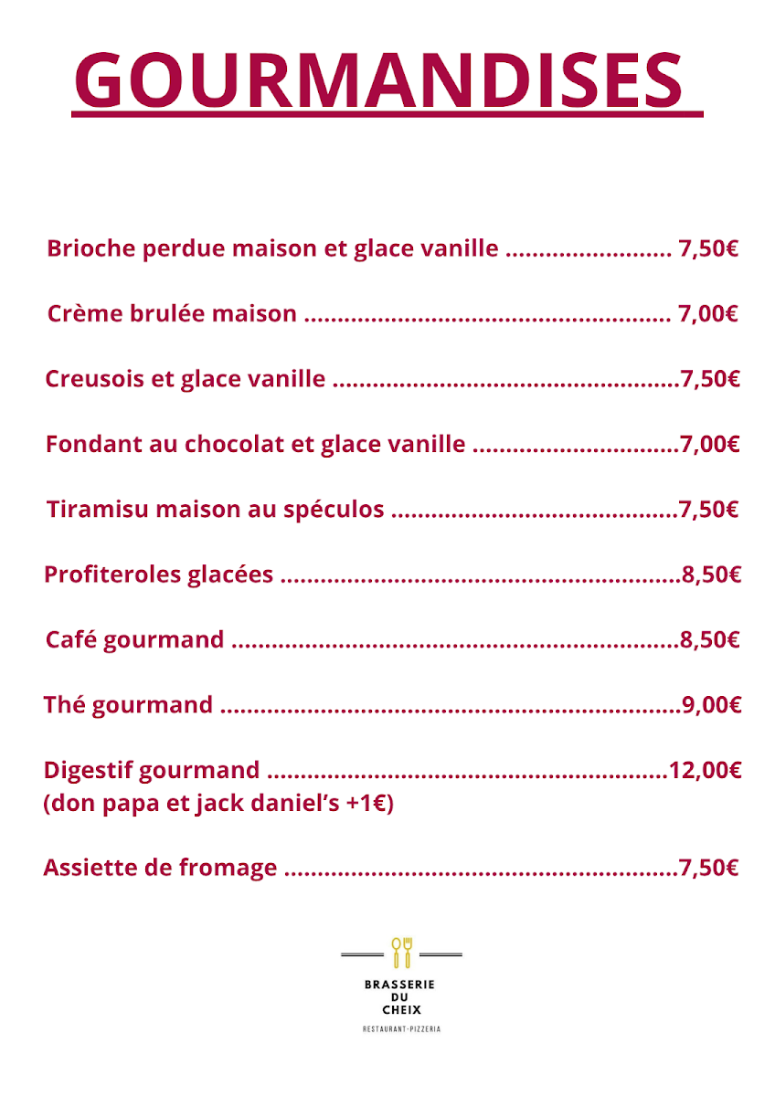 The menu at Brasserie Du Cheix offers a delightful variety of dishes, with something for every taste. For those seeking a satisfying meal, the Carte au Choix presents a selection of flavorful options. The pizza section, Nos Pizzas, is sure to please, featuring options like La Cheix (a pizza topped with delicious ingredients), priced at €12. If you’re in the mood for something sweet, their Les Gourmandises include a tempting array of desserts, which promise to be the perfect end to your meal. The drink menu is well-rounded, with a variety of options under Les Boissons and a further selection in Les Boissons Partie 2 to quench your thirst. Whether you’re enjoying a casual dinner or a special outing, Brasserie Du Cheix’s menu combines great flavors at reasonable prices, making it a worthwhile stop for anyone in La Souterraine.