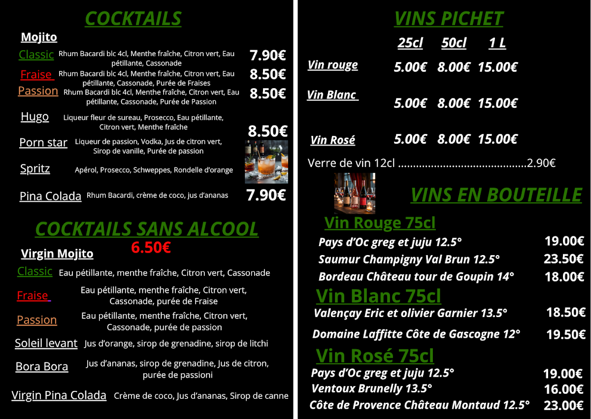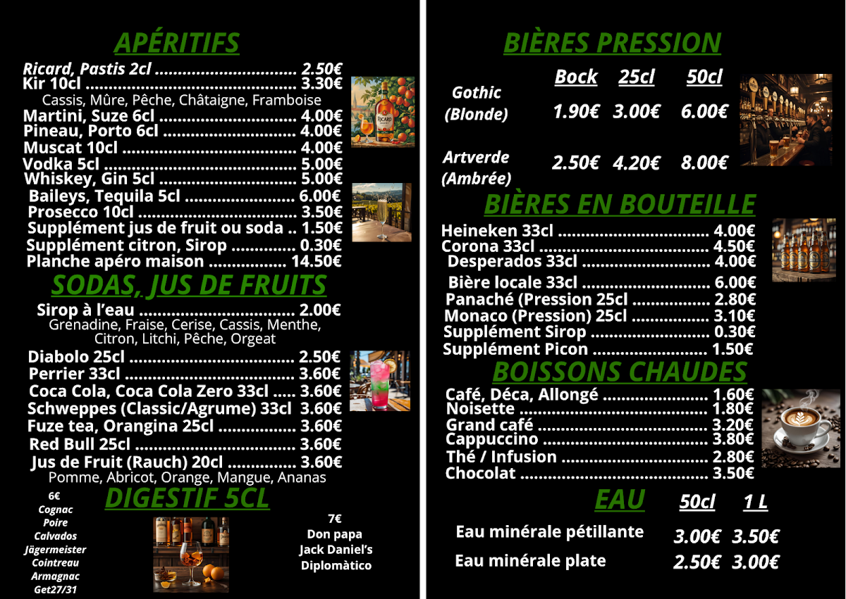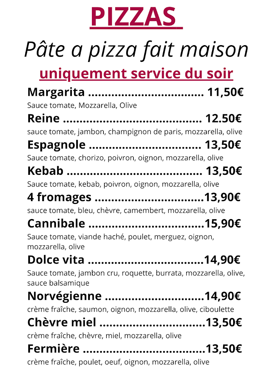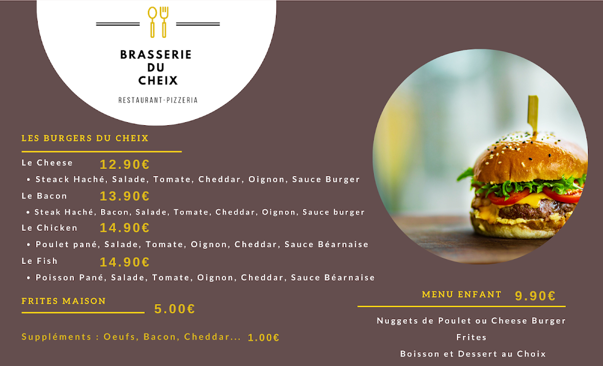 The menu at Brasserie Du Cheix offers a delightful variety of dishes, with something for every taste. For those seeking a satisfying meal, the Carte au Choix presents a selection of flavorful options. The pizza section, Nos Pizzas, is sure to please, featuring options like La Cheix (a pizza topped with delicious ingredients), priced at €12. If you’re in the mood for something sweet, their Les Gourmandises include a tempting array of desserts, which promise to be the perfect end to your meal. The drink menu is well-rounded, with a variety of options under Les Boissons and a further selection in Les Boissons Partie 2 to quench your thirst. Whether you’re enjoying a casual dinner or a special outing, Brasserie Du Cheix’s menu combines great flavors at reasonable prices, making it a worthwhile stop for anyone in La Souterraine.